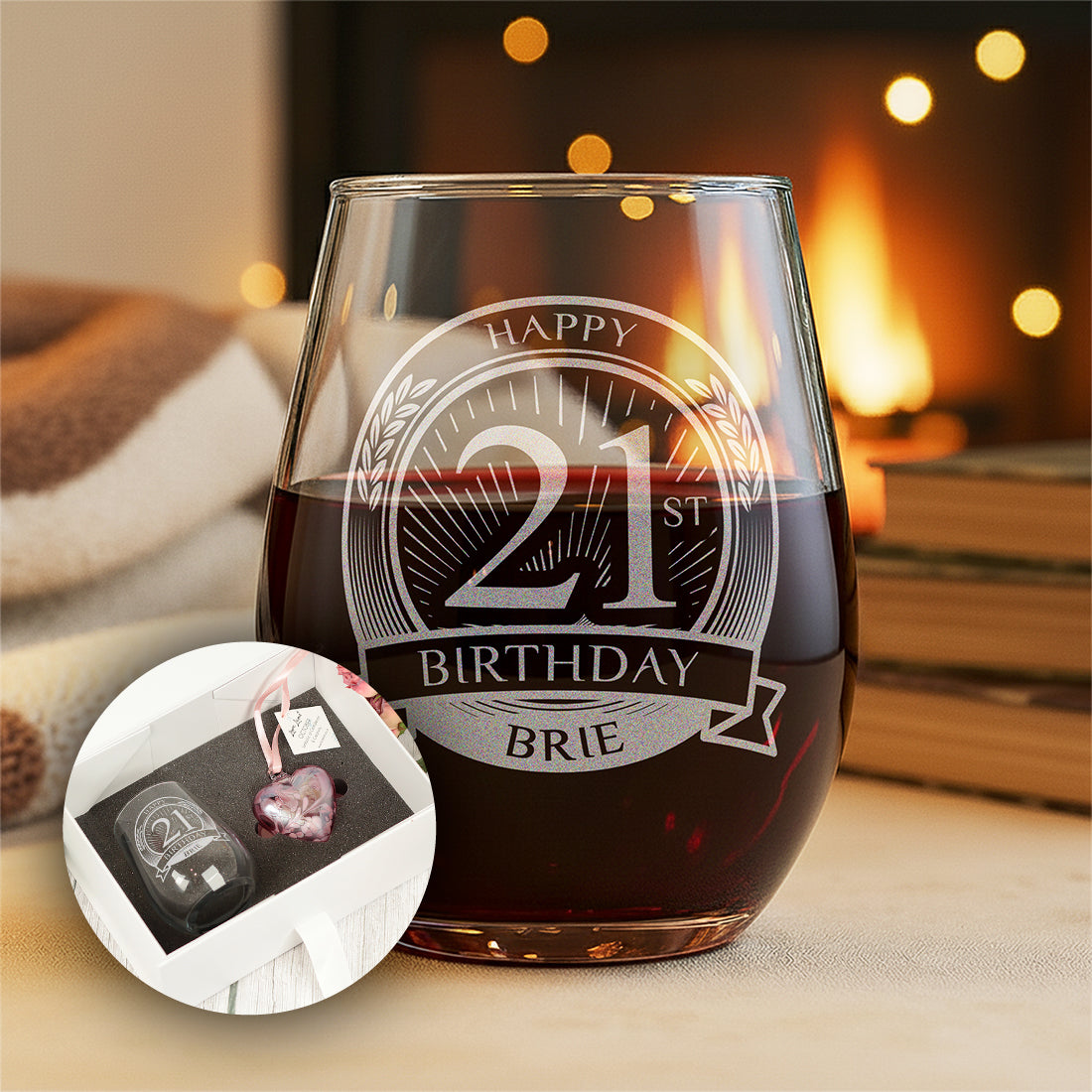 21st Birthday Stemless Glass and Birthstone Heart Gift Set