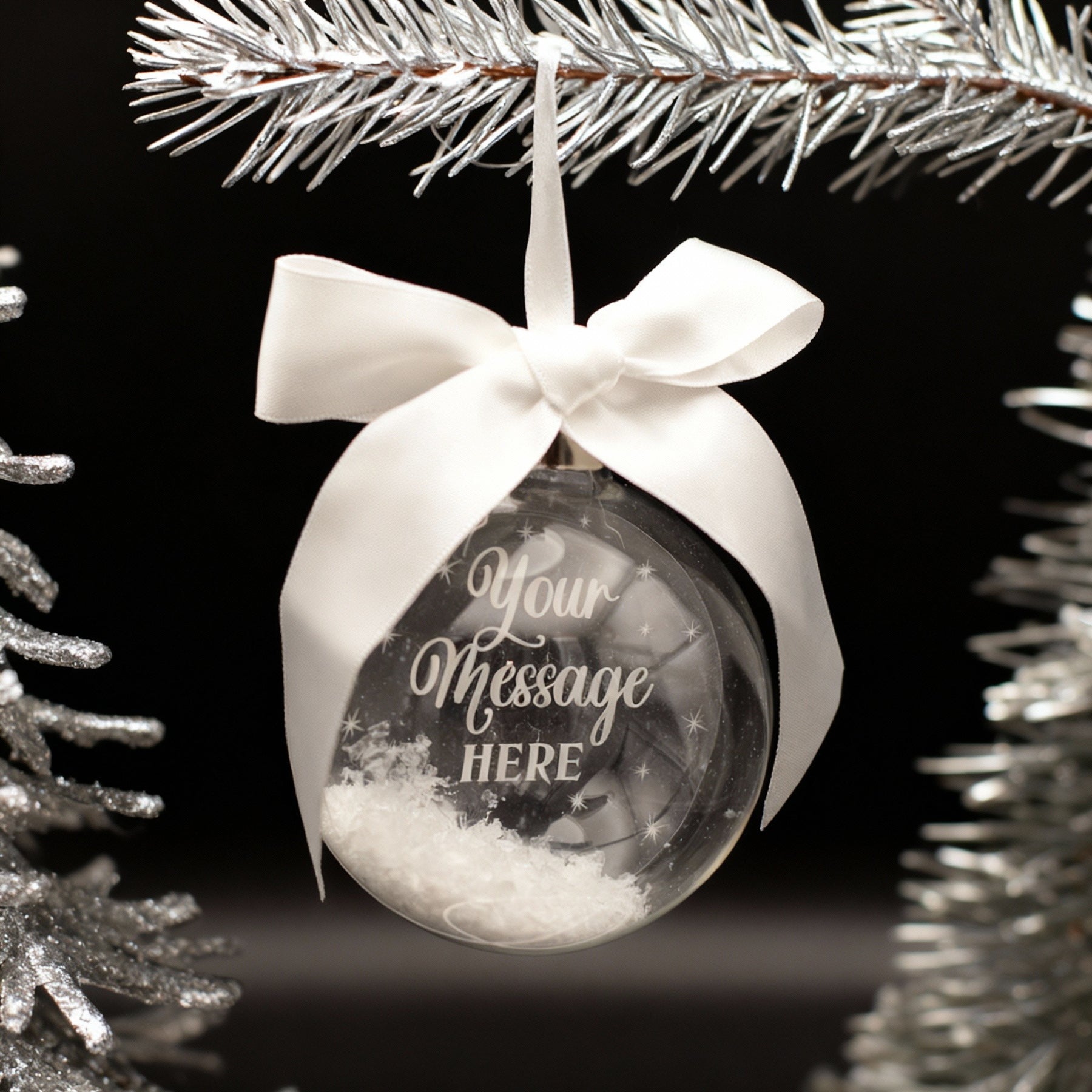 Inside the glass bauble is a clear acrylic disc printed in white ink with your chosen message so you can create a unique and one-of-a-kind bauble.