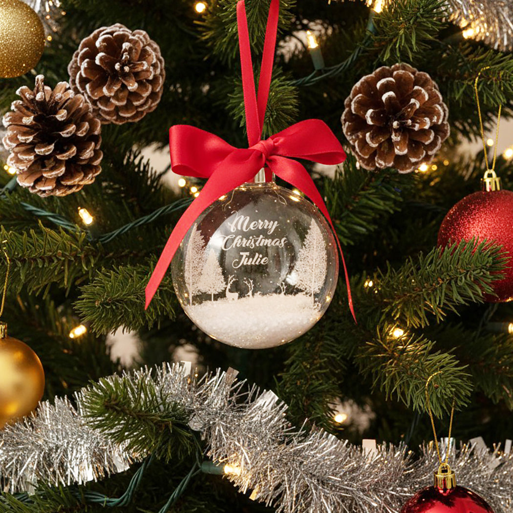 Inside the glass bauble is a clear acrylic disc printed with a snowy forest and deer theme.