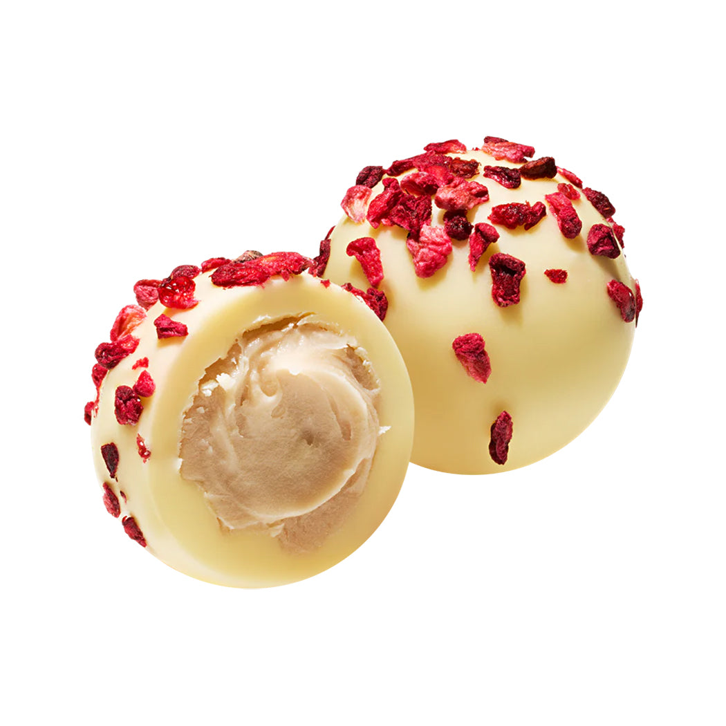 A tray of six decadent white chocolate truffles with a raspberry & champagne filling.