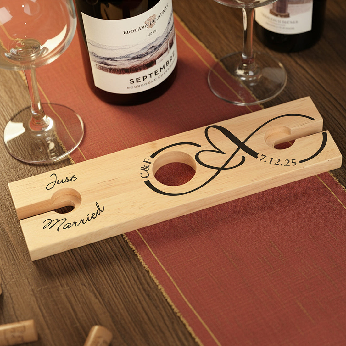 • A wooden bottle butler printed with the message "Just Married" and the infinity symbol