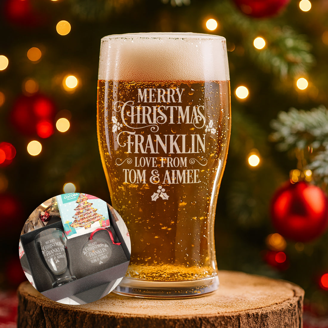 Say 'Cheers' to the magic of the season with this personalised :Pint Glass and gift set.