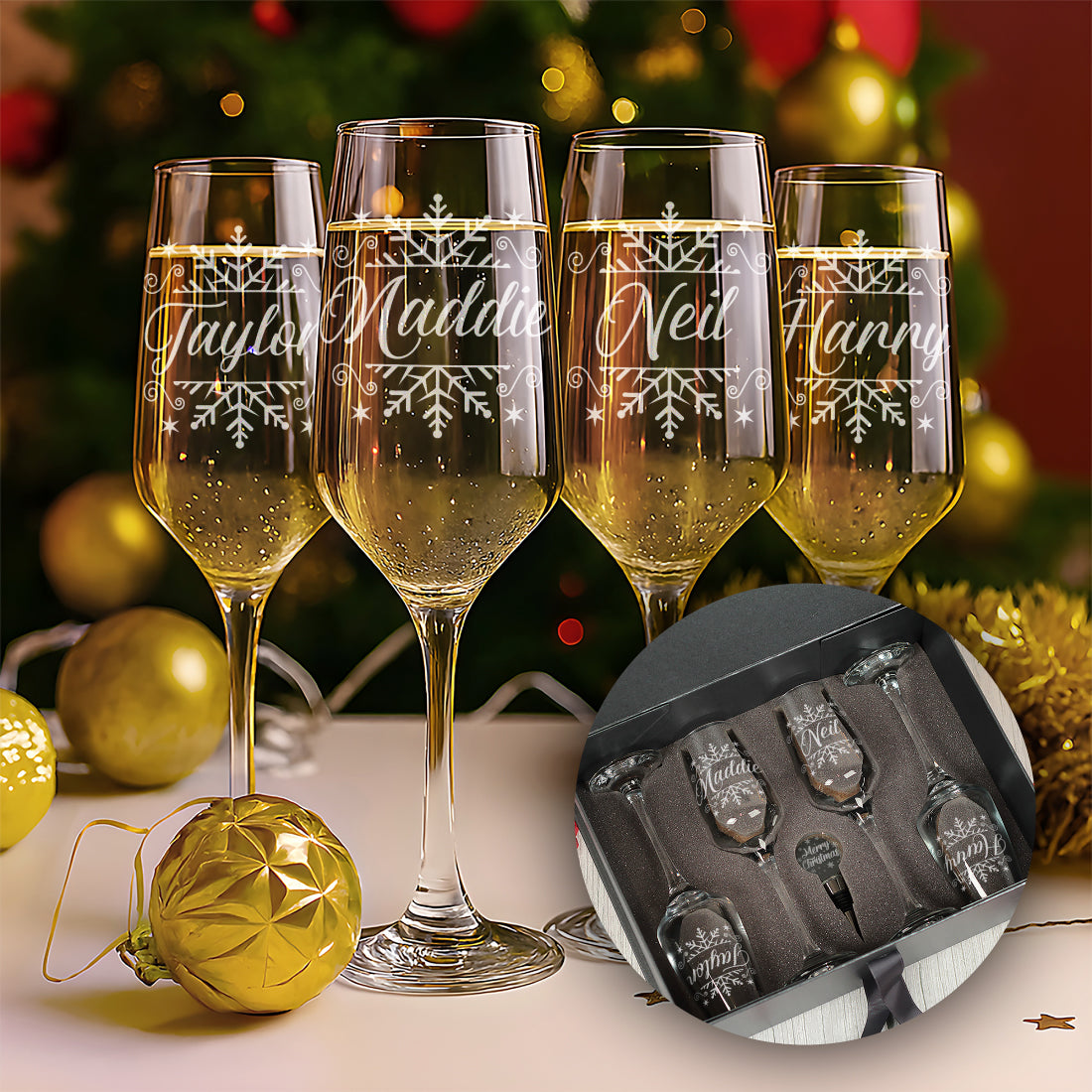 Christmas Snowflake Champagne Flute with Coaster and Decoration Gift Set