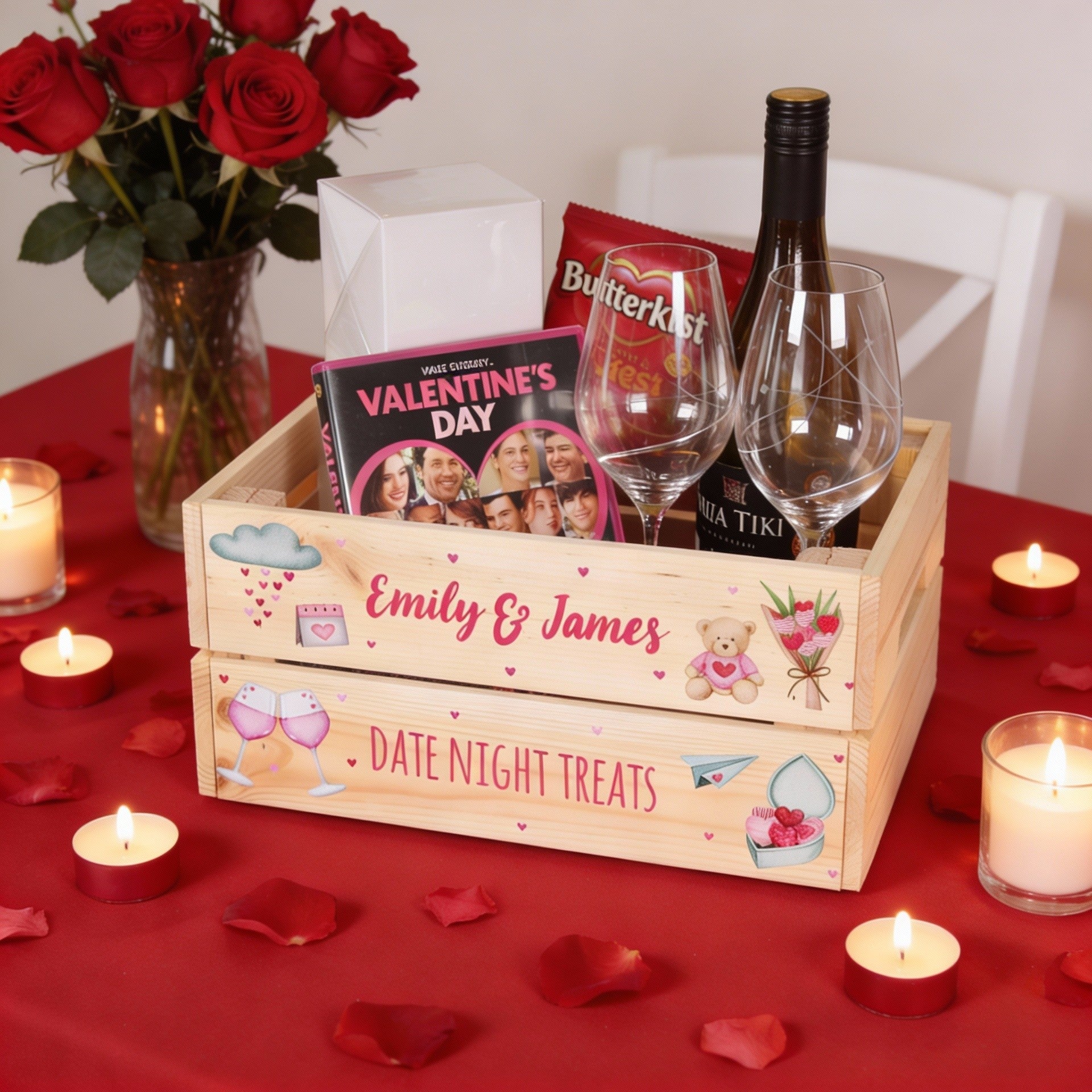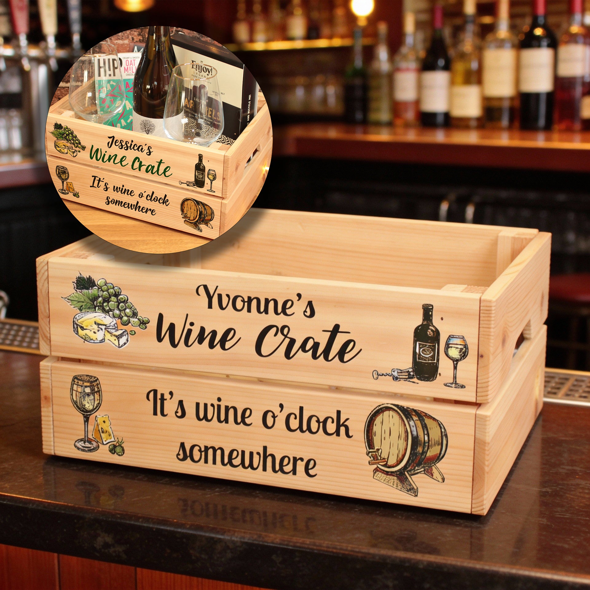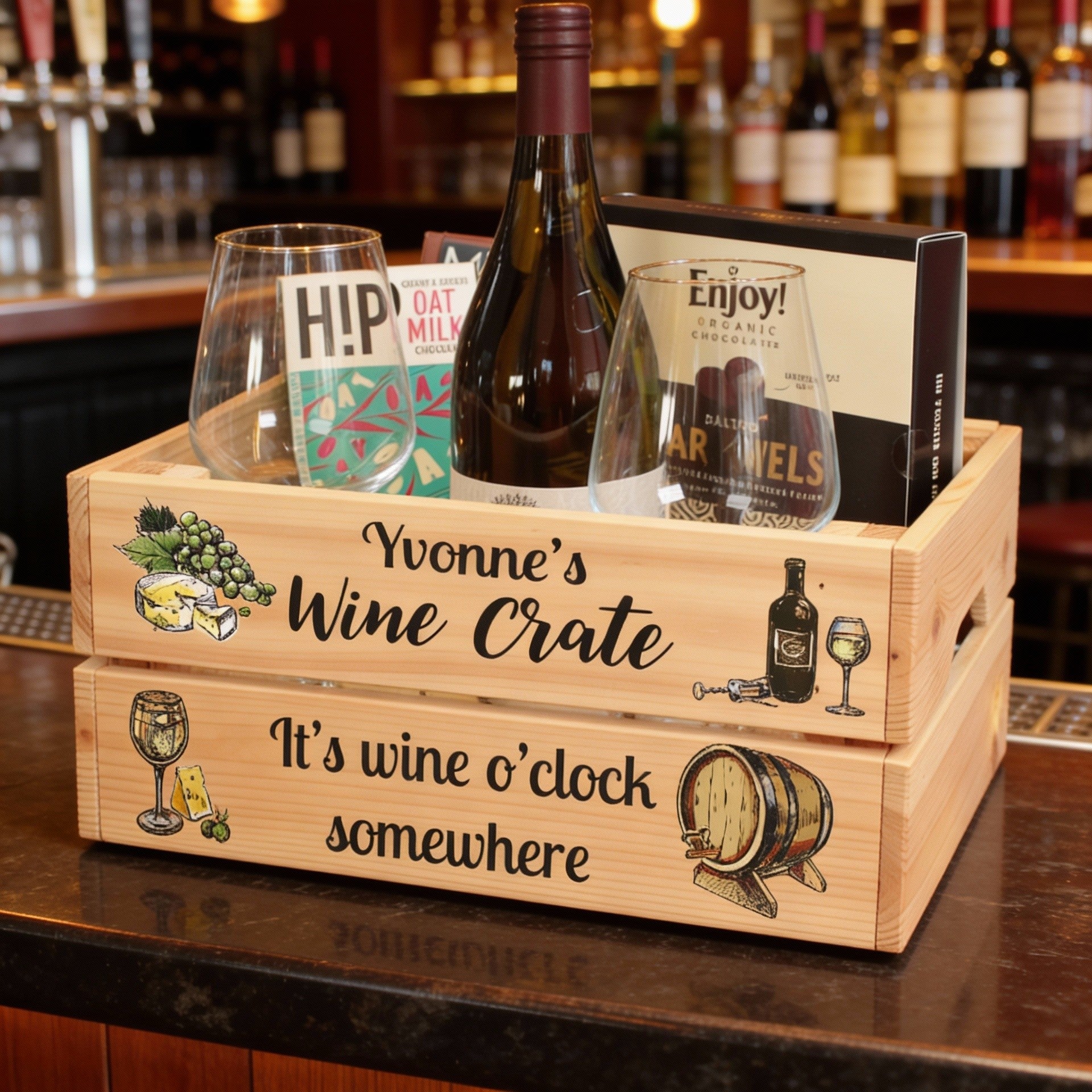 Personalised gift crates ready to be filled with goodies and treats for any occasion. Perfect for gin gifts, coffee gifts, Prosecco gifts and much more. A great alternative to a Christmas Eve box and a perfect sweet treat hamper for Easter and Halloween.