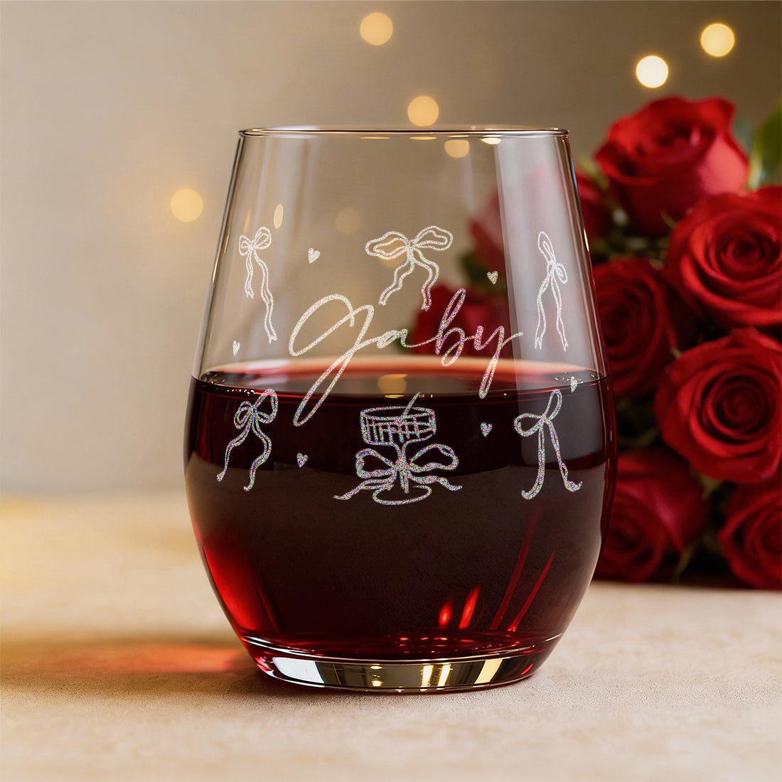 The tumbler is of a modern design with crystal clear glass, laser engraved by us and personalised with their name surrounded by whimsical bows and hearts to create a thoughtful, one-of-a-kind keepsake gift that they'll use and display with pride.