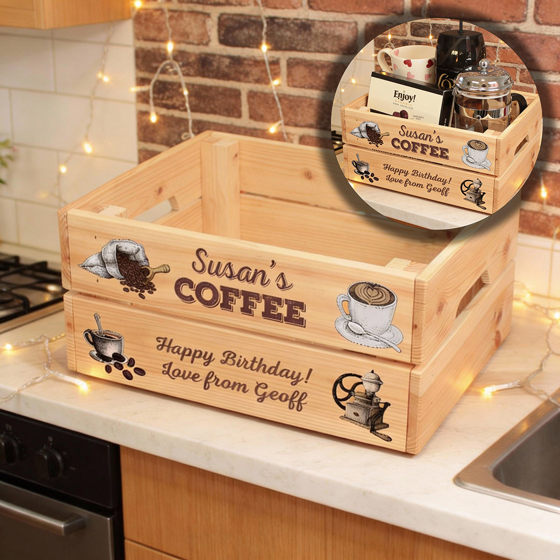 A fun Coffee themed wooden crate personalised with the name of your choice and personal message - a perfect Mother's Day or Birthday crate to fill with lots of goodies for any Coffee lover! It then doubles up as a handy and attractive storage crate for keeping their coffee beans and glasses neat and tidy.