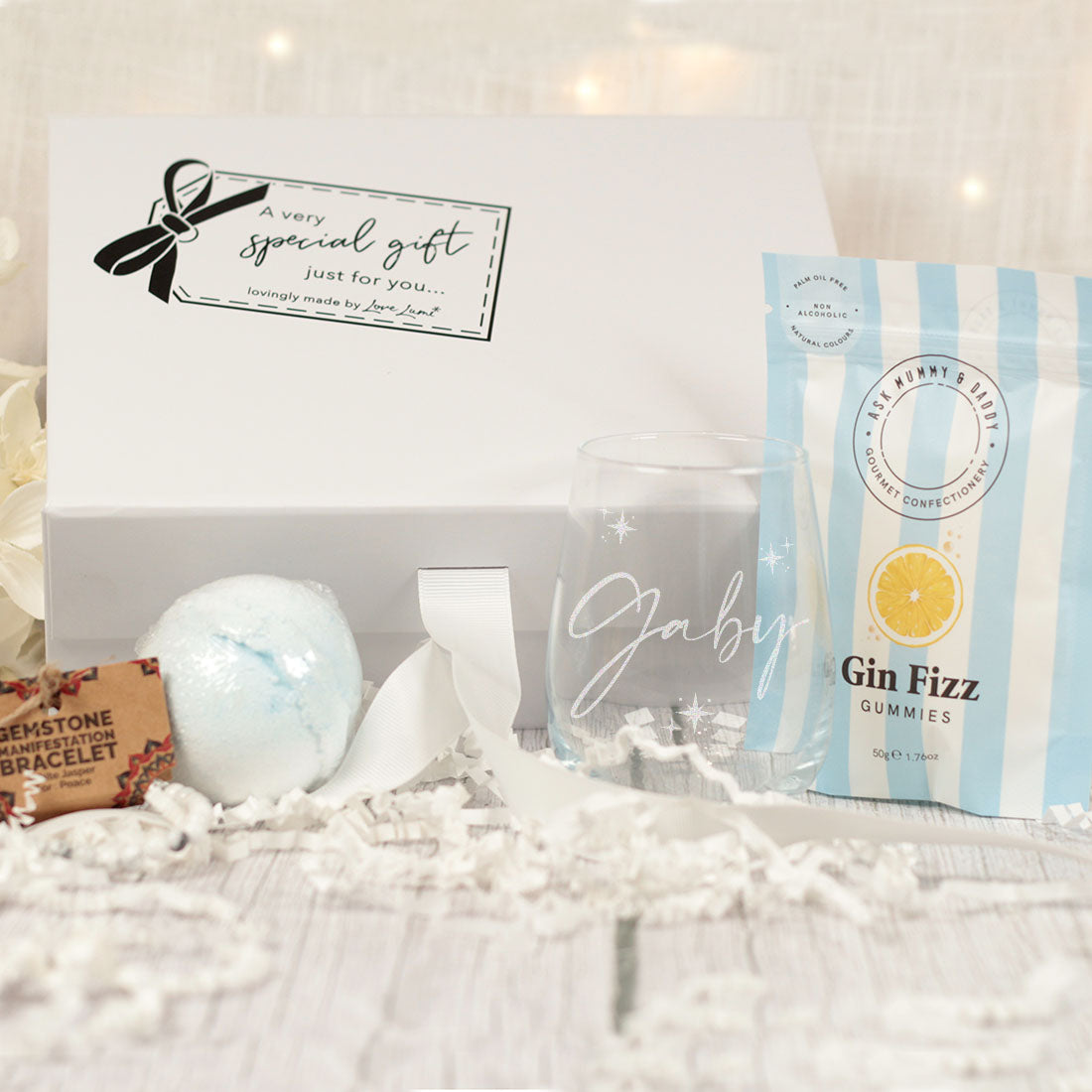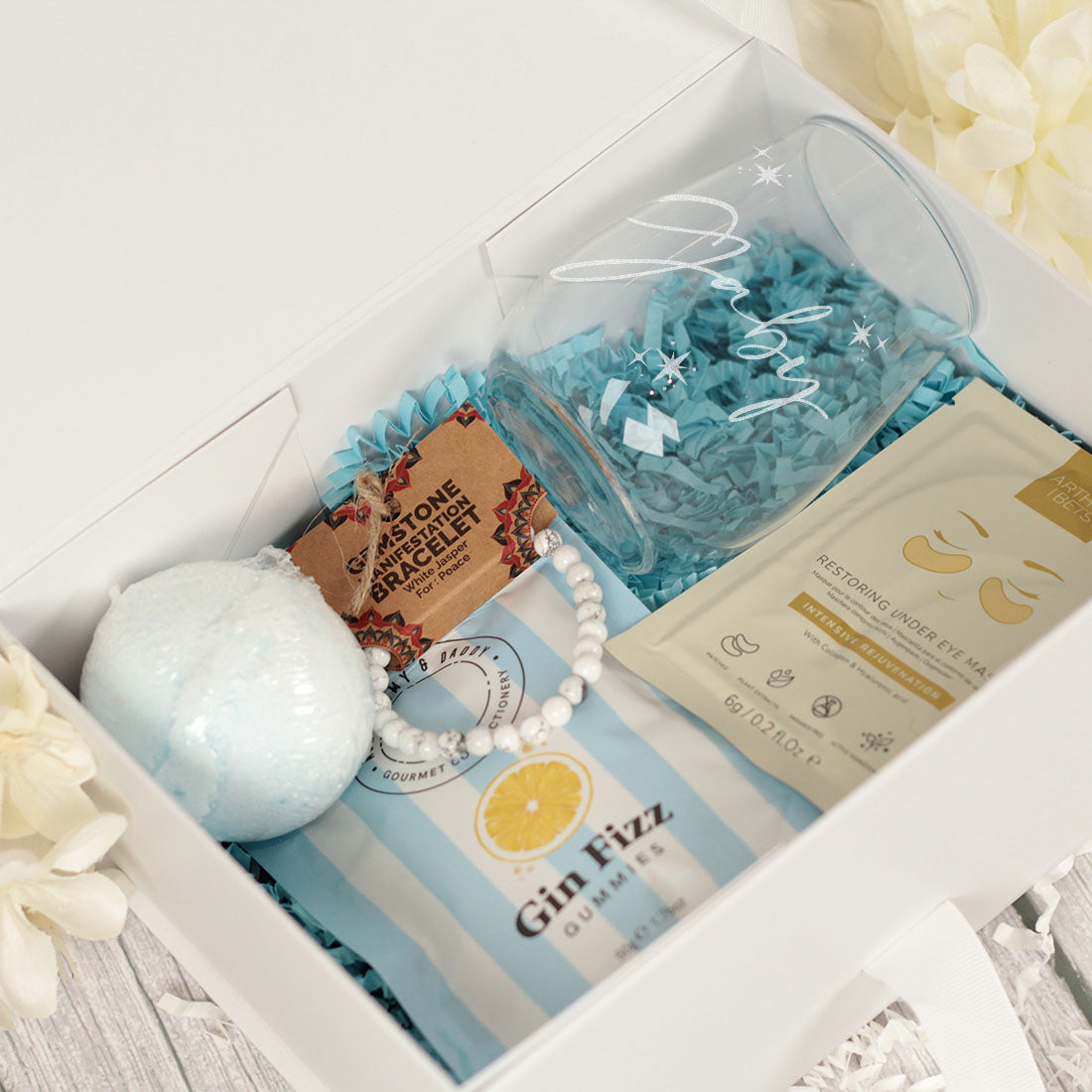 The gifts are all neatly presented in a luxury white gift box with crinkle paper filling and a gift tag.