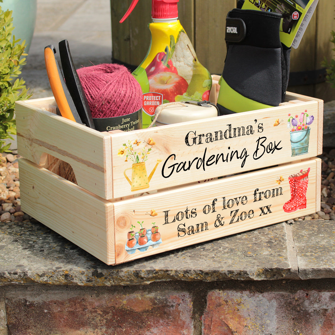 A pretty Gardening themed wooden crate personalised with the name of your choice and personal message - a perfect Mother's Day or Birthday crate to fill with lots of goodies for any keen gardener! It then doubles up as a handy and attractive storage crate for keeping their garden tools neat and tidy in a handy caddy to carry around with them.