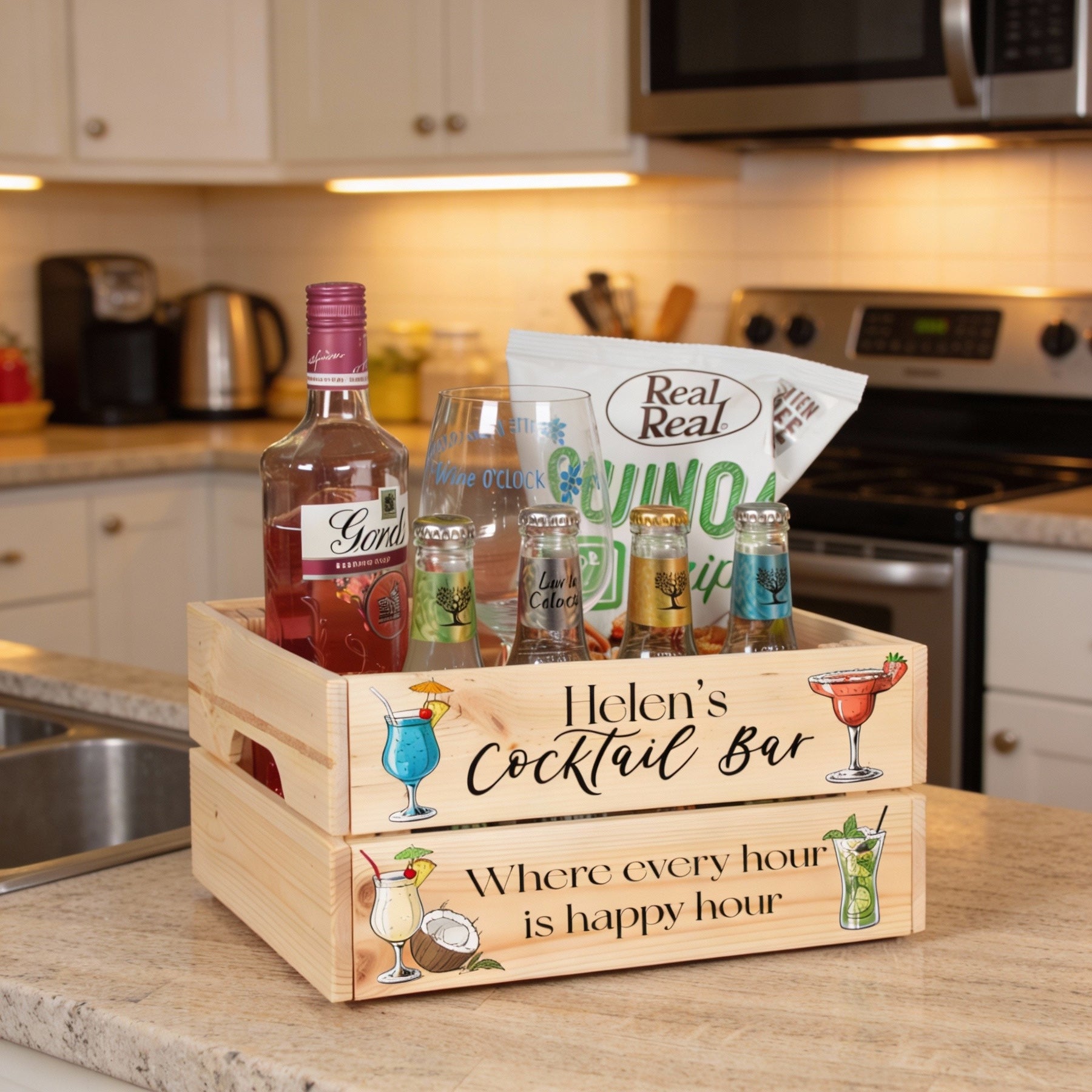 A fun Cocktail themed wooden crate personalised with the name of your choice and personal message - a perfect Mother's Day or Birthday crate to fill with lots of goodies for any Cocktail lover! It then doubles up as a handy and attractive storage crate for keeping their mixers and glasses neat and tidy.