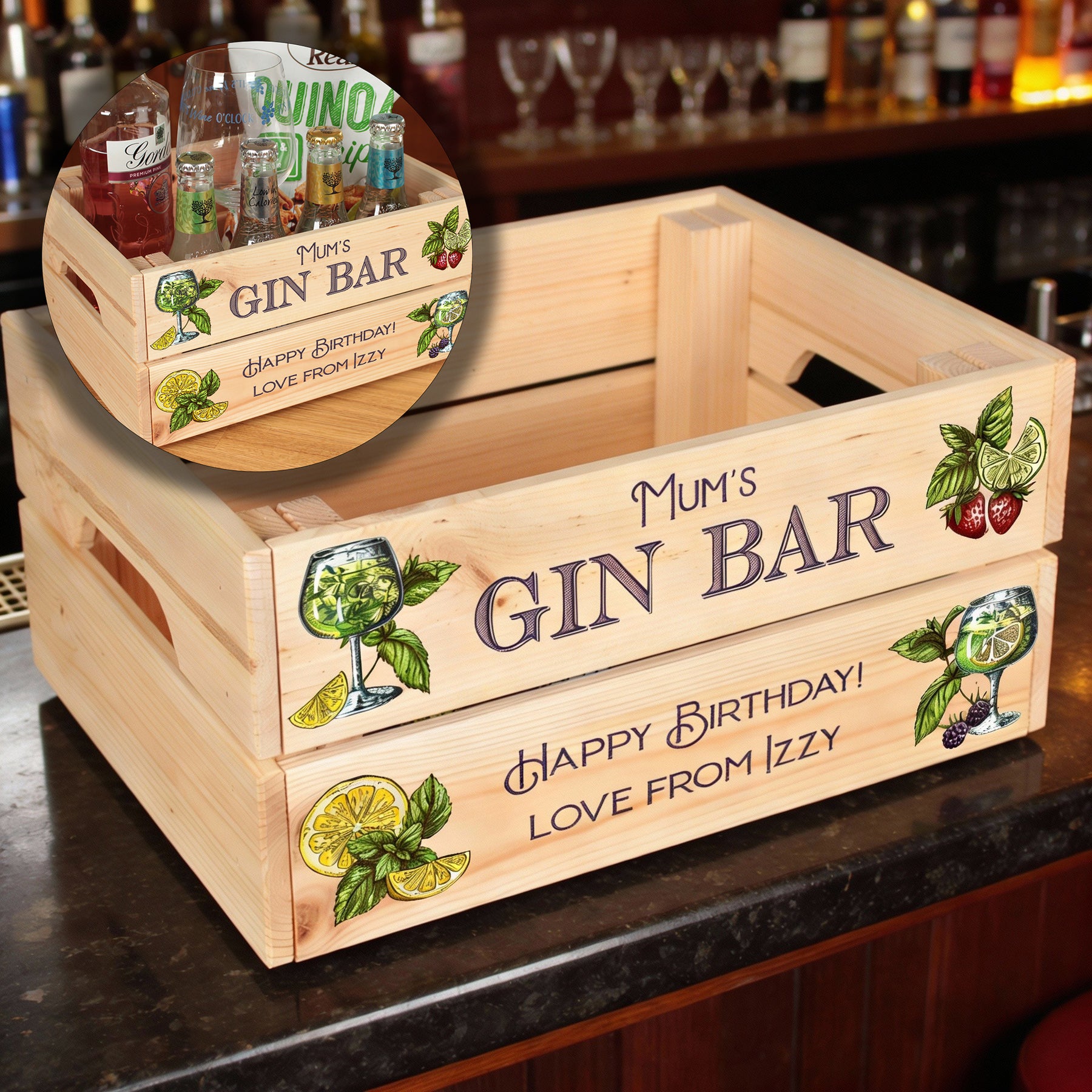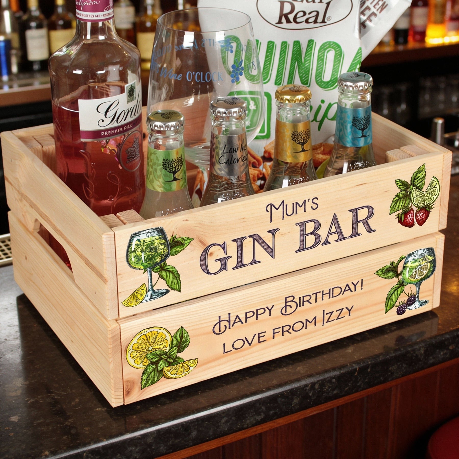 A fun Gin themed wooden crate personalised with the name of your choice and personal message - a perfect Mother's Day or Birthday crate to fill with lots of goodies for any Gin lover! It then doubles up as a handy and attractive storage crate for keeping their Gin, Tonic and Gin Glass neat and tidy.