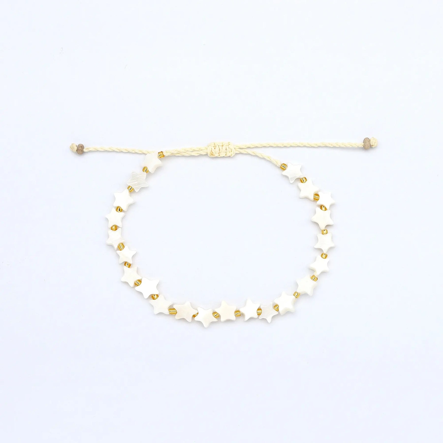 • A mother-of-pearl star bracelet - featuring delicate mother of pearl star beads and shimmering gold accents, this bracelet is a little piece of stardust for your wrist. Strung on a wax polyester cord and finished with a palm tree surfboard charm. Measures approx. 17cm with an adjustable sliding knot extension, 7cm cords each side for the perfect fit.