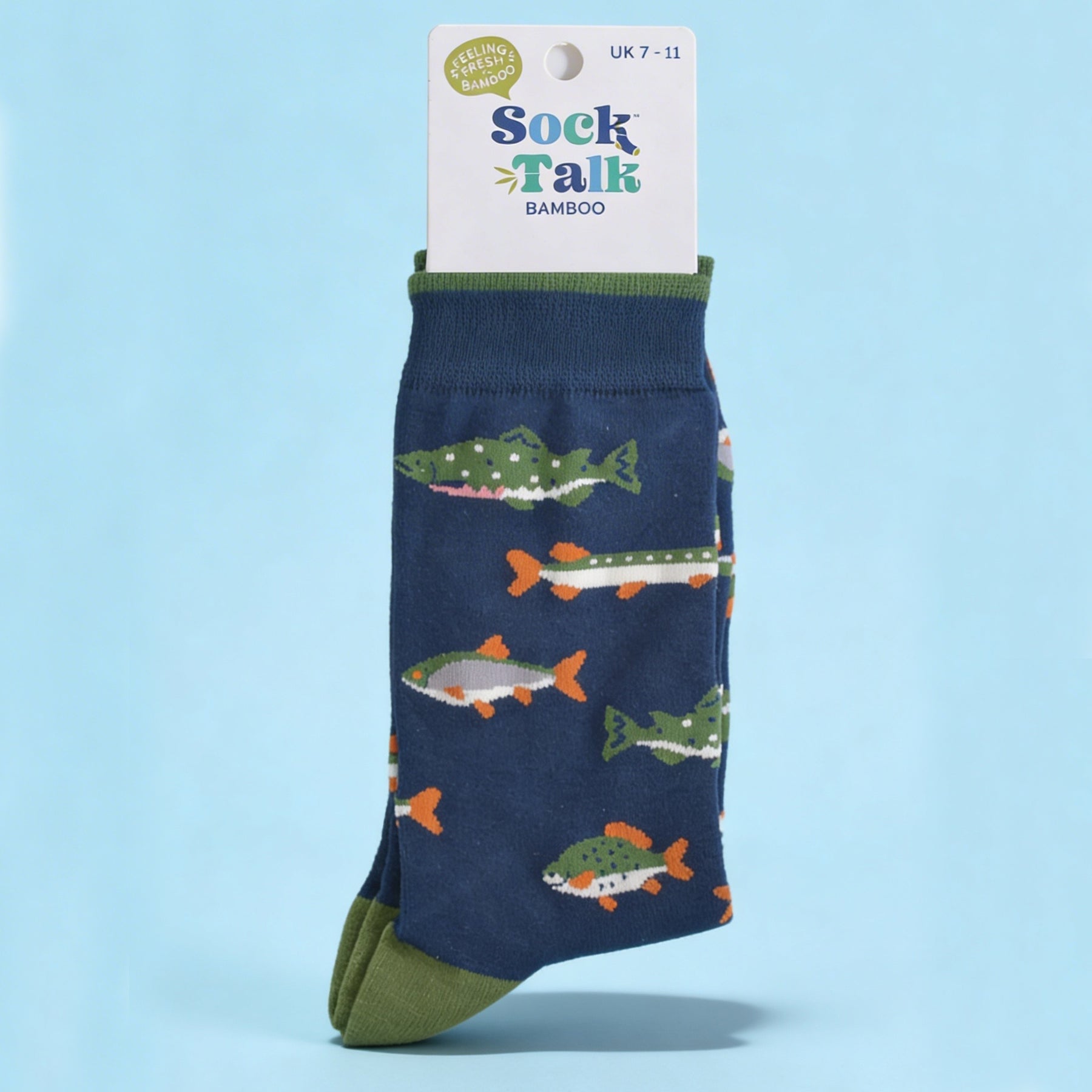 Designed in the UK, these fishing themed socks are crafted from eco-friendly sustainable bamboo. Showcasing a variety of river fish these dress socks are designed to feel luxuriously soft.