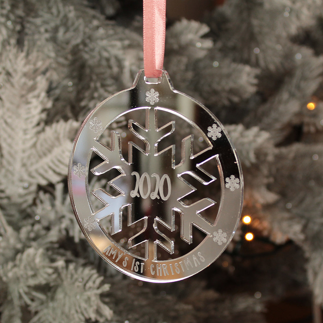 This gorgeous engraved Snowflake themed decoration is a perfect addition to your Christmas tree to celebrate the special first Christmas of the new arrival.