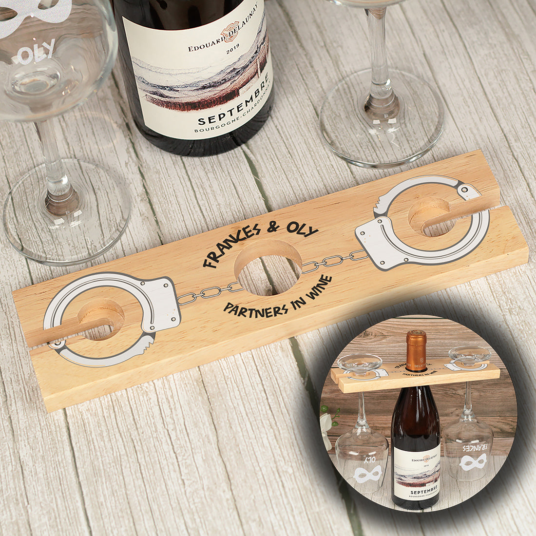 The wooden glasses holder sits over the neck of the bottle with a handy slot on each side to hold a glass in. Available as the butler only or add on matching glasses to create a complete gift for any special occasion.