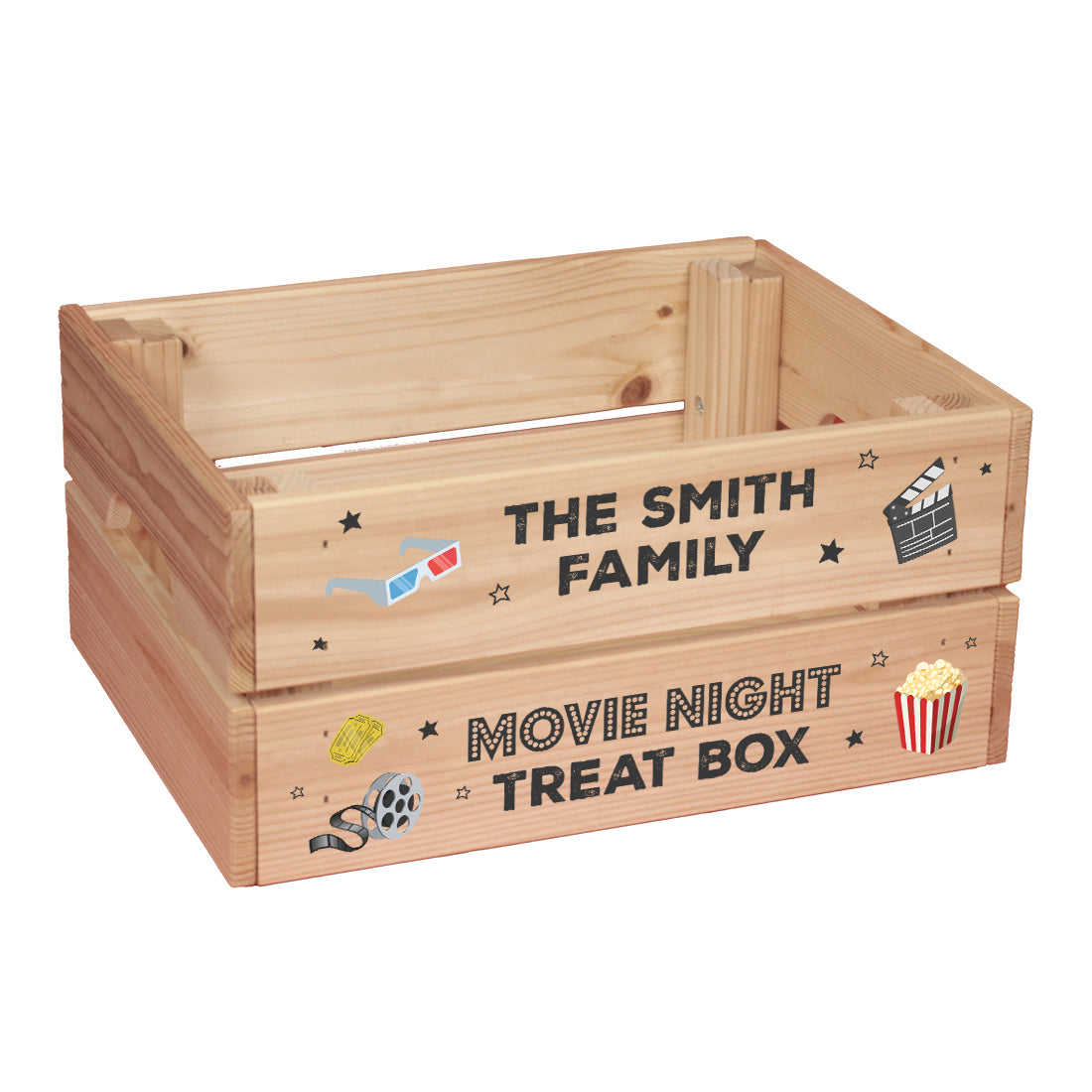 A fun Movie Night themed wooden crate personalised with the name/s of your choice and the message 'MOVIE NIGHT TREAT BOX' - a great way to plan a family movie night and get the children involved in filling it with lots of goodies to enjoy family time together.